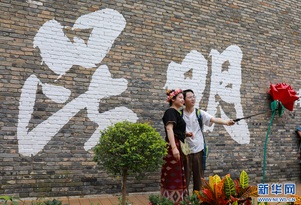 游客在昆明老街網(wǎng)紅打卡墻拍照(10月4日攝)。新華網(wǎng)發(fā)(鄭益 攝)