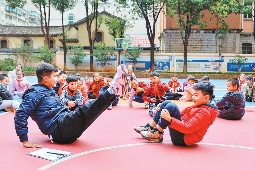 在昆明市武成小學(xué)教育集團(tuán)人民路校區(qū),體育老師帶領(lǐng)學(xué)生開(kāi)展體育訓(xùn)練。