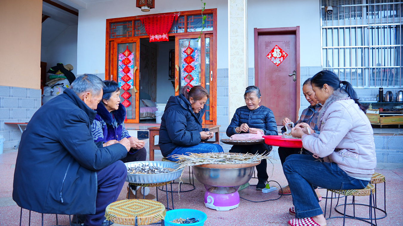楊開菊(右一)與鄰居一起加工石斛楓斗