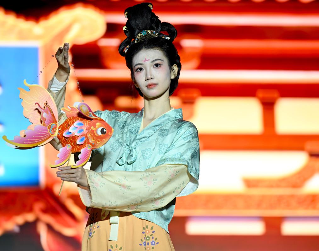 在河南省洛陽市洛邑古城,演員身著華服走秀。新華社記者郝源 攝