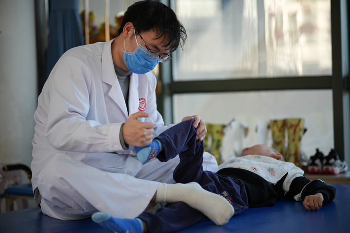 ??2月5日,一位福利院的老師正在給孩子進(jìn)行肢體康復(fù)訓(xùn)練。新華每日電訊記者 謝晗 攝