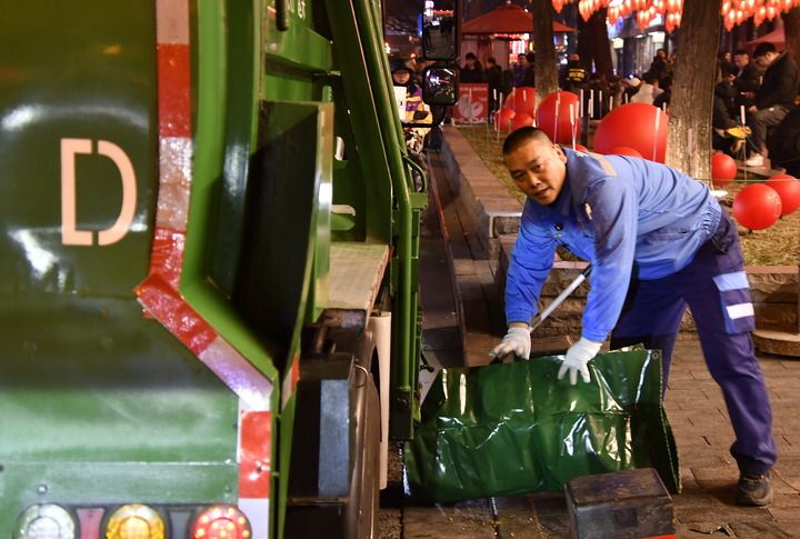 ??2月4日,在簋街清運(yùn)多年的李寧,裝運(yùn)完垃圾后清理環(huán)境。新華每日電訊記者 李欣 攝