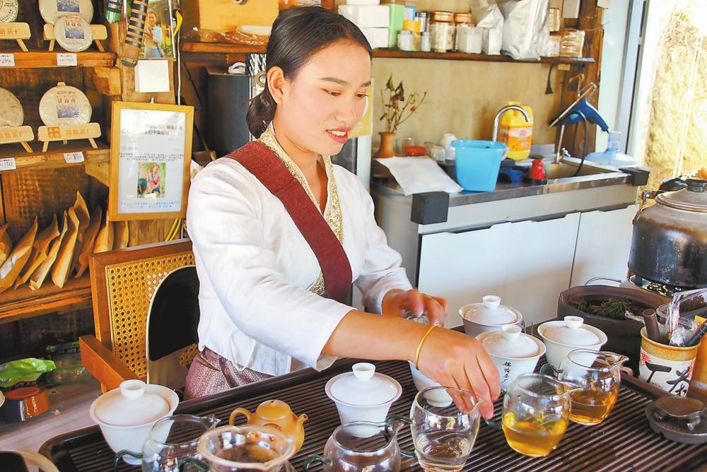 今年春節(jié)假期,景邁山又一次迎來旅游熱潮。走進仙金的茶店,總能看到她忙碌的身影。茶桌前坐著品茶的游客走了一波又來一波,店門口制作普洱茶冰淇淋的機器難有閑時,仙金還延伸出了教授游客自制茶餅的服務。此外,她經(jīng)營的民宿也早早被預訂一空。“過去,爸爸要挨家挨戶上門推銷,現(xiàn)在我們不用出寨子就能把茶賣出去。隨著游客增多,我們接觸到不同的群體和消費需求,開始走提升質量、精品化發(fā)展的路線?!毕山鹫f,自家的茶廠正計劃改造提升,未來將拓展更多生產(chǎn)線,制作更高標準的精品茶葉。