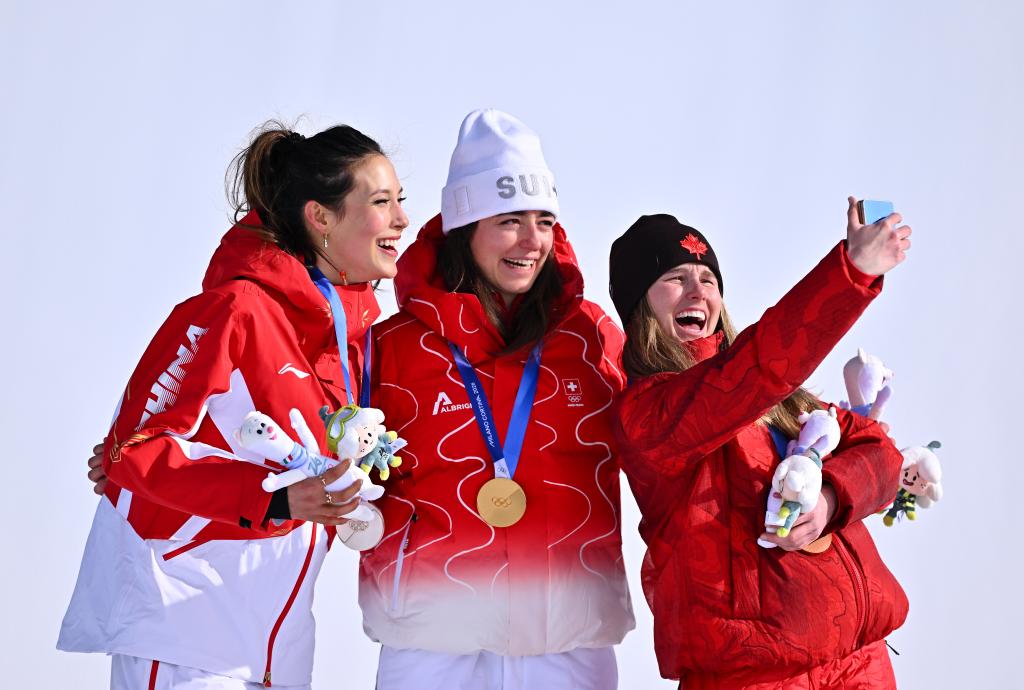 2月9日,瑞士選手瑪?shù)贍柕隆じ窭啄拢ㄖ校?,中國選手谷愛凌(左)和加拿大選手梅根·奧爾德姆在領(lǐng)獎臺上合影。新華社記者 張宏祥 攝