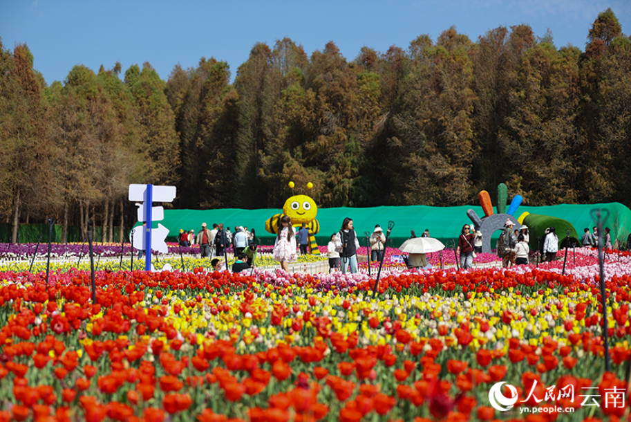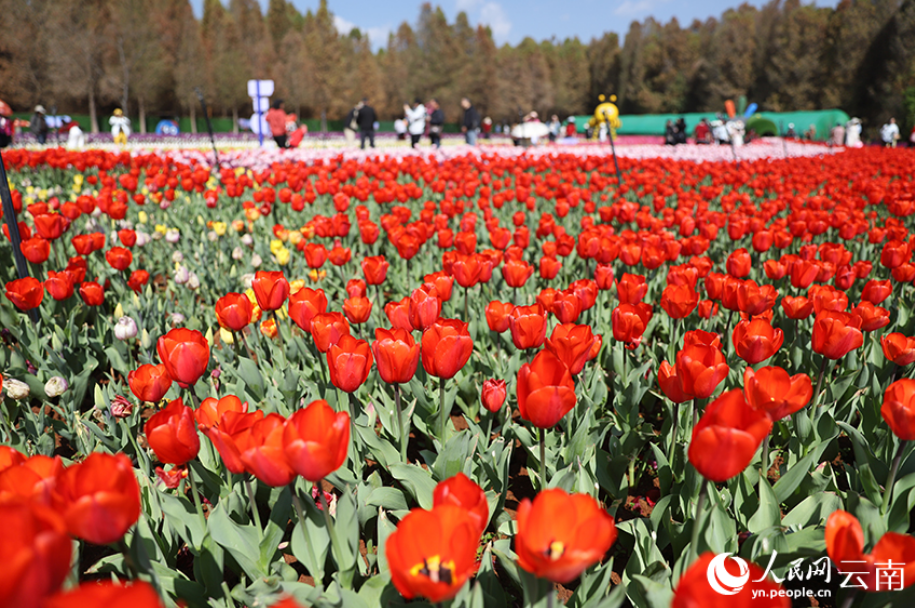 春節(jié)期間,云南昆明撈漁河國家濕地公園內(nèi)百萬株郁金香迎來盛花期,紅、粉、紫等各色花朵連片綻放,交織成絢麗花海,為新春佳節(jié)增添了濃濃春意,成為游客休閑打卡的熱門去處。(人民網(wǎng) 記者李發(fā)興)