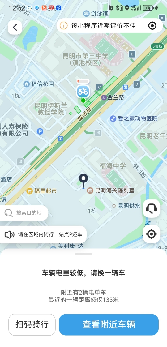 在滇池路昆明市第一水質(zhì)凈化廠附近,路邊一輛“春城出行”電單車掃碼后提示“車輛電量較低,請換一輛車”,同時頁面顯示“附近有2輛電單車,最近的一輛距離您僅133米”,但點(diǎn)擊“掃碼騎行”按鈕后無任何跳轉(zhuǎn)及反應(yīng)。同樣,在滇池路滇池集市門口的非機(jī)動車停放區(qū),記者掃碼另一輛該品牌電單車時,頁面提示“車輛報修中,請換一輛車”,并顯示附近還有3輛電單車,最近距離167米,但多次嘗試仍無法解鎖。
