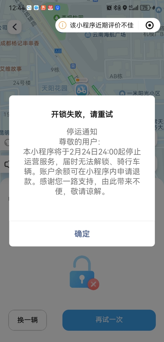 西壩路某小區(qū)門口停放的兩輛“春城出行”電動車,掃碼后則顯示:“本小程序?qū)⒂?月24日24:00起停止運(yùn)營服務(wù),屆時無法解鎖、騎行車輛。賬戶余額可在小程序內(nèi)申請退款。感謝您一路支持,由此帶來不便,敬請諒解?!倍诃h(huán)城西路某小區(qū)門口,兩輛該品牌電單車停在非機(jī)動車位內(nèi),掃碼后屏幕僅顯示一串?dāng)?shù)字代碼,無任何功能提示或操作選項(xiàng),車輛完全失去響應(yīng)。