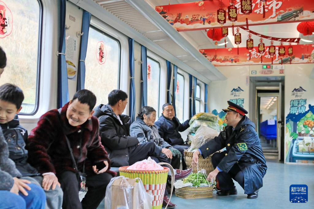 2月25日,村民坐在5630次列車的惠農(nóng)專區(qū)車廂里。列車緩緩駛向遵義市桐梓站。新華社發(fā)(張維 攝)