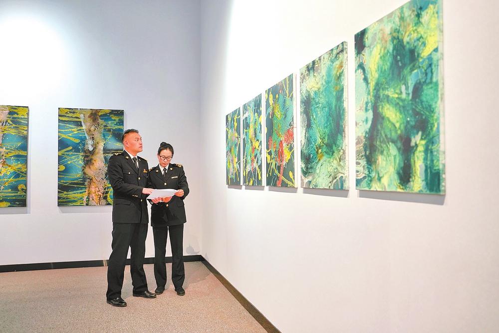 海關(guān)關(guān)員在云南省博物館對(duì)展出畫作進(jìn)行現(xiàn)場(chǎng)監(jiān)管。云南日?qǐng)?bào) 通訊員邱渝璠 攝
