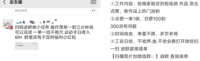 第一步,不法分子在貼吧、各大視頻平臺、QQ、微信上廣發(fā)“短視頻點(diǎn)贊”獲取傭金的廣告,以“動動手就能日進(jìn)百金”的幌子誘導(dǎo)受害者上鉤。