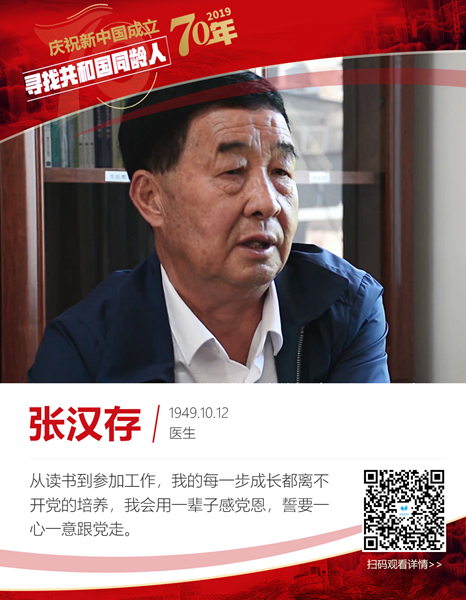 張漢存,出生于1949年10月12日,作為共和國(guó)的同齡人,他從醫(yī)41年,扎根基層,服務(wù)著一方百姓,見(jiàn)證了新中國(guó)成立以來(lái)基層醫(yī)療衛(wèi)生的發(fā)展變遷。[詳情]