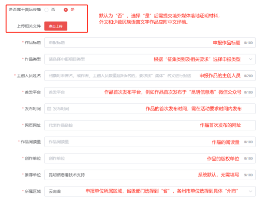 作品標(biāo)題、申報類型、主創(chuàng)人員姓名、作品首發(fā)平臺、發(fā)布時間、作品網(wǎng)址(音視頻和專題專欄需附上二維碼)、作品閱讀量、創(chuàng)作單位、推薦單位、所屬區(qū)域?!皣H傳播作品”在頁面選擇“是”后需提交落地證明材料,外文和少數(shù)民族語言文字作品應(yīng)附中文譯稿,不得改寫或超出原文內(nèi)容。選擇填報說明如下: