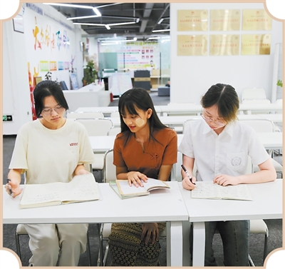 緬甸姑娘德信嬌(中)正在與中國學(xué)生一起學(xué)習(xí)交流。張朝華攝