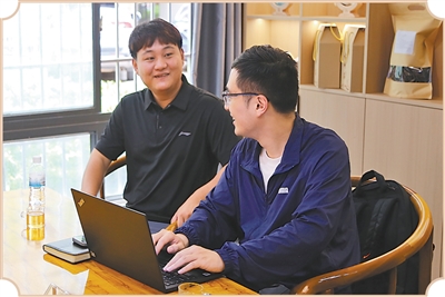 本報記者在臨滄邊境經(jīng)濟(jì)合作區(qū)緬甸大學(xué)生創(chuàng)業(yè)園采訪雪兵偉(左)。張朝華攝