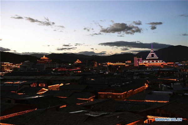 Photo taken on June 20, 2018 shows a night scenery of the ancient town of Dukezong in Shangri-la City in Diqing Tibetan Autonomous Prefecture, southwest China's Yunnan Province. The ancient town of Dukezong, established more than 1,300 years ago, is known for its Tibetan-style architectures. (Xinhua/Yang Zongyou)