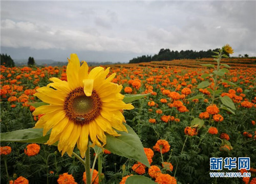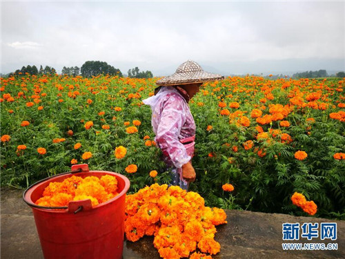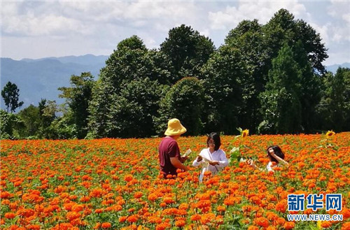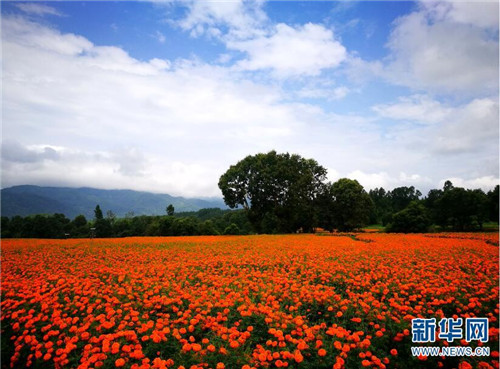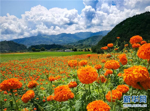 [InKunming--Yunnan] With the arrival of autumn, more than 13 square kilometers of marigold bloom in Jie Tou town of Yunnan’s Tenchong city, at the foot of Gaoligong mountain, attracting a large number of tourists and opening up new channels for local farmers to become rich.