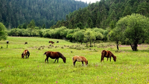 In fact, there are different views all year round in Diqing. In spring, trees sprout and green grass come around; in summer, various flowers bloom everywhere, presenting a colorful sight; in autumn, leaves turn into yellow and fall with wind; in winter, heavy snow hits the ground.