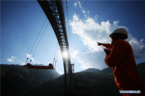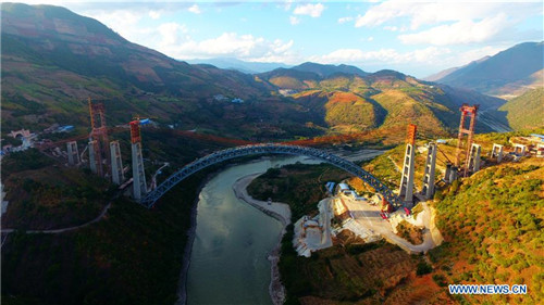 [InKunming--Yunnan] With a grand arch bridge erected on Monday morning across the Nujiang River in southwestern China's Yunnan Province, Chinese constructors have built the world's longest-spanning railway arch bridge.