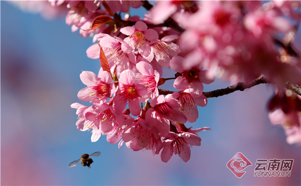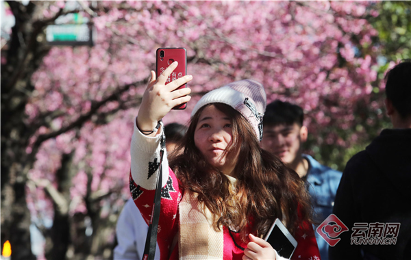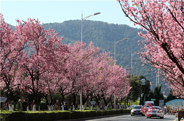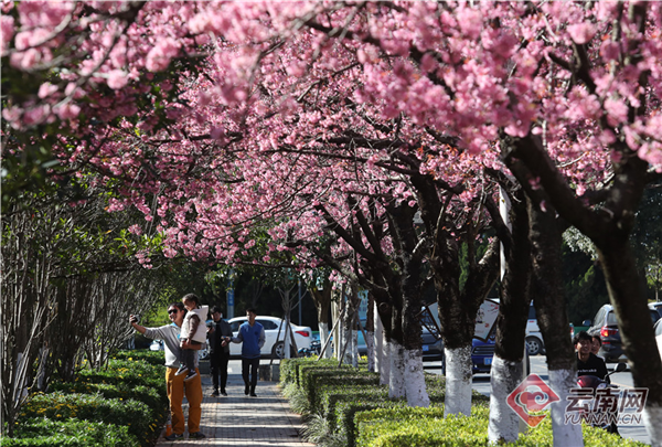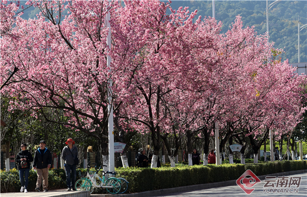 [InKunming--Kunming] Kunming is well-known for its year-round flowery and green view. At the end of December, prosperous pink winter cherry blossoms are seen along Hongta West Road, becoming a net popular scenery caught in the spotlight of visitors.