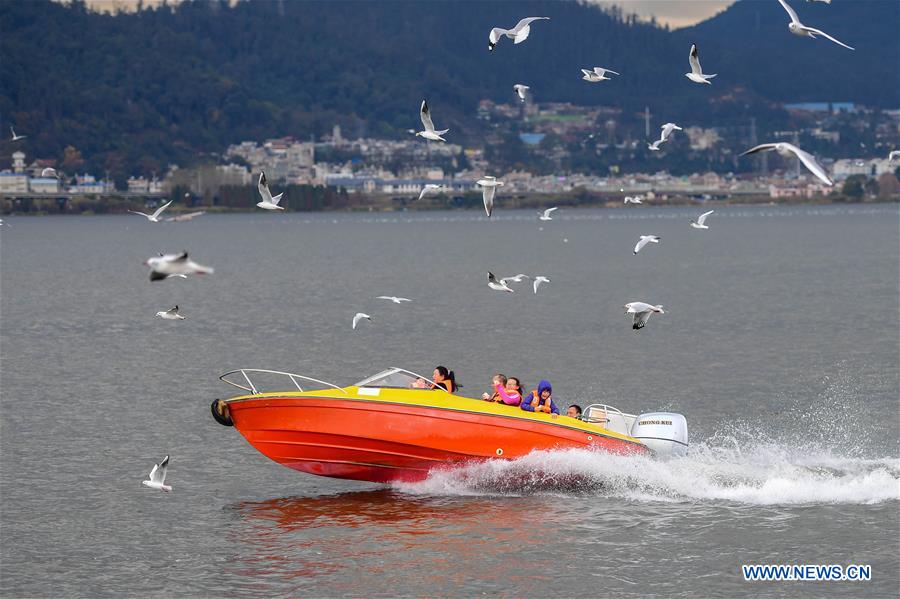 [InKunming--Kunming] Tourists view black-headed gulls at Haigeng dam in Kunming, capital of southwest China's Yunnan Province, Jan. 1, 2019. Migratory black-headed gulls became an attraction for tourists during the New Year holiday. (Xinhua/Hu Chao)