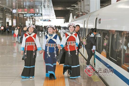 Train attendants wearing Naxi costumes pose for a photo. [Photo/yunnan.cn]