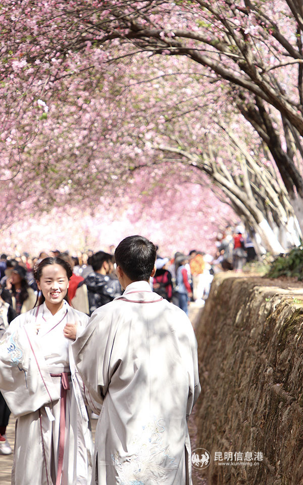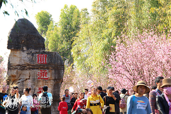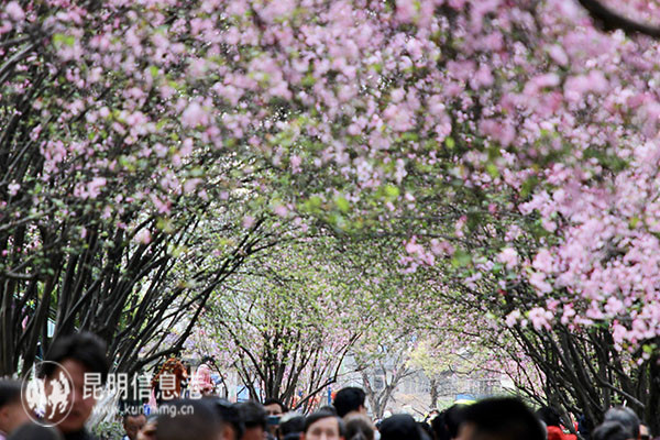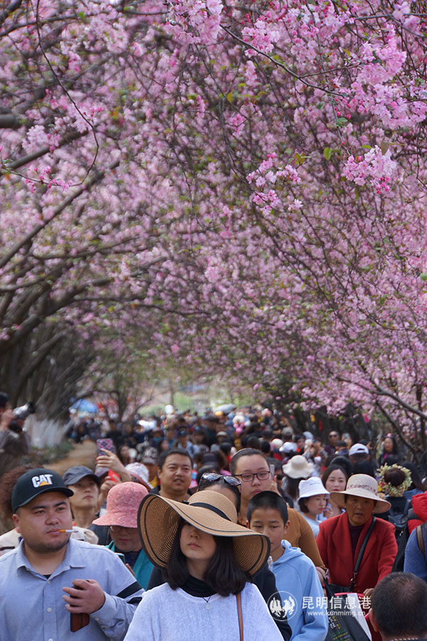 Visitors roam on the hall crabapple avenue. The 20th Kunming Cherry Blossom Festival kicked off at Kunming Yuantong Mountain Zoo on March 1st. [Photo by Su Wenqian/InKunming]