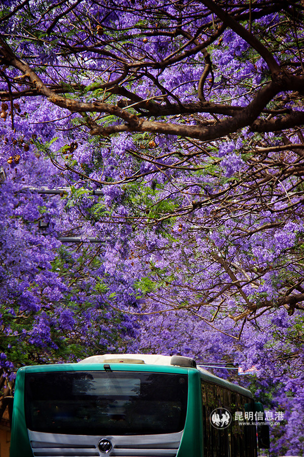 Photo taken on May 2, 2019 shows a bus is going through jacaranda road. [InKunming/ Su Wenqian]