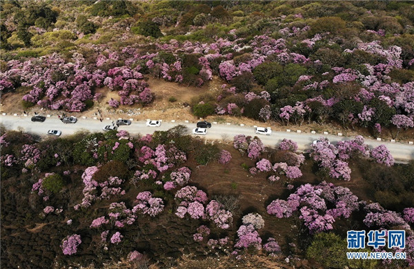 Photo shows cars pass through the azalea sea on Maer Mountain in Dali, Yunnan.
