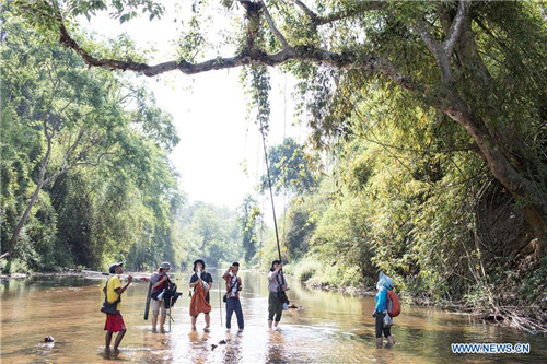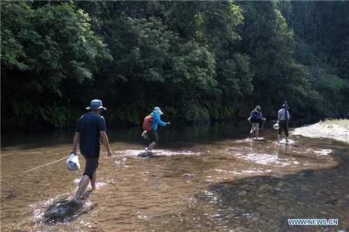 Researchers walk on their way to collect plant samples in the Tamanthi Wildlife Sanctuary in north Myanmar, May 28, 2019. A China-Myanmar joint field expedition made up with researchers from the Southeast Asia Biodiversity Research Institute, Chinese Academy of Sciences (CAS-SEABRI) and the Natural Resources and Environmental Conservation of Myanmar, is doing researches on the biodiversity of the Tamanthi Wildlife Sanctuary in north Myanmar. The expedition, the eighth of its kind since 2014, began on May 14 and will last to June 15. (Xinhua/Jin Liwang)