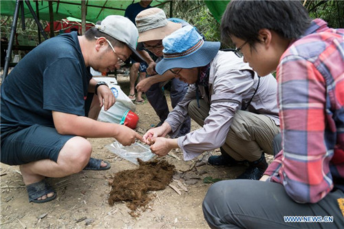 Researchers analyze the excrement of elephant to judge its food source in the Tamanthi Wildlife Sanctuary in northern Myanmar, May 24, 2019. A China-Myanmar joint field expedition, made up with researchers from the Southeast Asia Biodiversity Research Institute of the Chinese Academy of Sciences (CAS-SEABRI) and the Natural Resources and Environmental Conservation of Myanmar, is doing researches on the biodiversity of the Tamanthi Wildlife Sanctuary in northern Myanmar. The expedition, the eighth of its kind since 2014, began on May 14 and will last til June 15. (Xinhua/Jin Liwang)