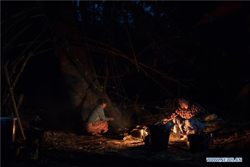 Local chef cooks dinner at the campsite in the Tamanthi Wildlife Sanctuary in north Myanmar, May 24, 2019. A China-Myanmar joint field expedition, made up with researchers from the Southeast Asia Biodiversity Research Institute of the Chinese Academy of Sciences (CAS-SEABRI) and the Natural Resources and Environmental Conservation of Myanmar, is doing researches on the biodiversity of the Tamanthi Wildlife Sanctuary in northern Myanmar. The expedition, the eighth of its kind since 2014, began on May 14 and will last till June 15. (Xinhua/Jin Liwang)