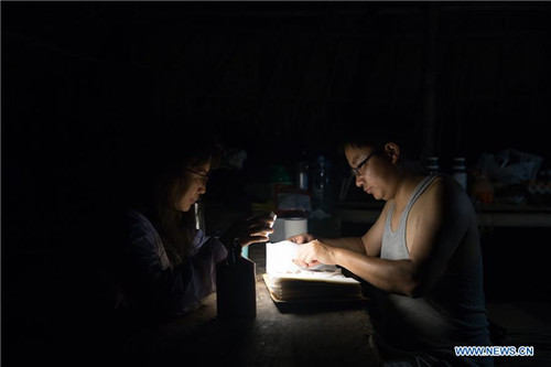 Chinese researchers check plant samples at their campsite in the Tamanthi Wildlife Sanctuary in north Myanmar, May 27, 2019. A China-Myanmar joint field expedition, made up with researchers from the Southeast Asia Biodiversity Research Institute of the Chinese Academy of Sciences (CAS-SEABRI) and the Natural Resources and Environmental Conservation of Myanmar, is doing researches on the biodiversity of the Tamanthi Wildlife Sanctuary in northern Myanmar. The expedition, the eighth of its kind since 2014, began on May 14 and will last till June 15. (Xinhua/Jin Liwang)