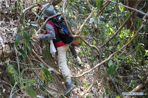 A Chinese researcher climbs to collect plant samples in the Tamanthi Wildlife Sanctuary in north Myanmar, May 28, 2019. A China-Myanmar joint field expedition made up with researchers from the Southeast Asia Biodiversity Research Institute, Chinese Academy of Sciences (CAS-SEABRI) and the Natural Resources and Environmental Conservation of Myanmar, is doing researches on the biodiversity of the Tamanthi Wildlife Sanctuary in north Myanmar. The expedition, the eighth of its kind since 2014, began on May 14 and will last to June 15. (Xinhua/Jin Liwang)