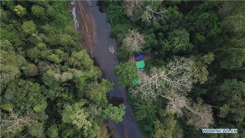 Aerial photo taken on May 26, 2019 shows a campsite of the China-Myanmar joint field expedition in the Tamanthi Wildlife Sanctuary in north Myanmar. A China-Myanmar joint field expedition, made up with researchers from the Southeast Asia Biodiversity Research Institute of the Chinese Academy of Sciences (CAS-SEABRI) and the Natural Resources and Environmental Conservation of Myanmar, is doing researches on the biodiversity of the Tamanthi Wildlife Sanctuary in northern Myanmar. The expedition, the eighth of its kind since 2014, began on May 14 and will last till June 15. (Xinhua/Jin Liwang)