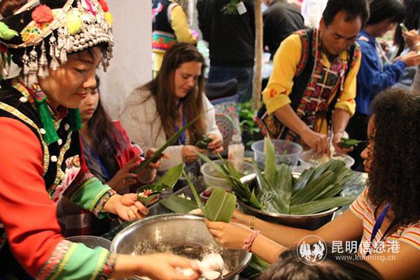 [InKunming--Kunming] With the Dragon Boat Festival, known as “端午” in Chinese, around the corner,Kunming Information Hub organized “Zongzi Making Activity” under the framework of “Unveiling Yunnan” on June 1. 11 foreigners from the United States and Pakistan gathered together at Xiao Wuliang (小無量) Restaurant, learning to make zongzi and knowing deep about Chinese culture.