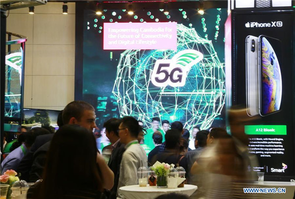 People visit the first 5G live trial showcase held by Smart Axiata in Phnom Penh, Cambodia, on July 8, 2019. Cambodia's leading mobile telecommunications company Smart Axiata has partnered with China's technology giant Huawei to build the 5G network in Cambodia, representatives of the two companies said on Monday. (Xinhua/Phearum)