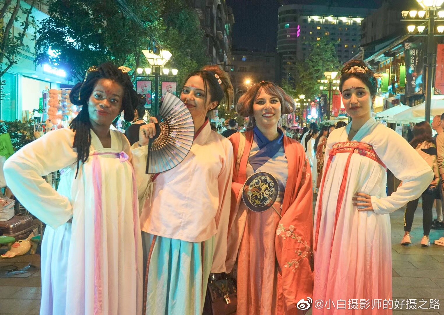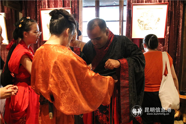 14 foreigners, with the help of the members of Yunnan Han Chinese Clothing Association, put on the Han Chinese Clothing (Hanfu). Four girls, Ilef Ben Abbes, Salma Dabbar, and Asma Mestiri (from Tunisia) and Joelle Abro (from Ivory Coast) tucked up their hair with Chinese hairpins. They took selfies and had facetime with families when dressed up.“Just like a traditional Chinese woman now.”Ilef said.