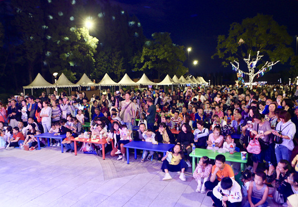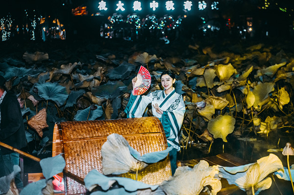 Mid-Autumn Festival performances and high-tech light shows given by Daguan Park attracted numerous visitor to celebrate festival, experience Chinese culture and admire the beauty of the park in the night. A waterway between lotus was specially set to allow performers in elegant Chinese han clothes to play Chinese pipa on boats.
