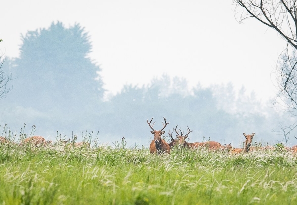 Milu deer, also known as Pere David's deer, wander at a national nature reserve in Shishou, central China's Hubei Province, May 17, 2021. (Xinhua/Xiao Yijiu)