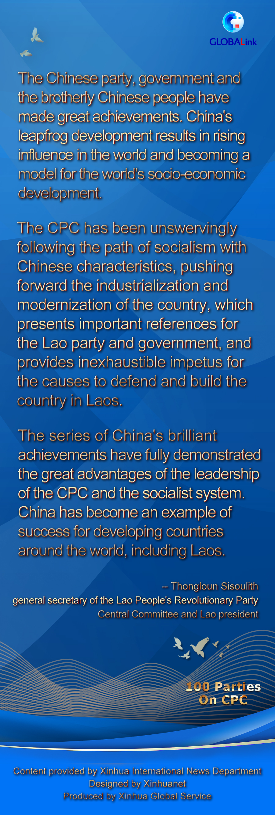 "The CPC has been unswervingly following the path of socialism with Chinese characteristics, pushing forward the industrialization and modernization of the country, which presents important references for the Lao party and government, and provides inexhaustible impetus for the causes to defend and build the country in Laos," said Thongloun.