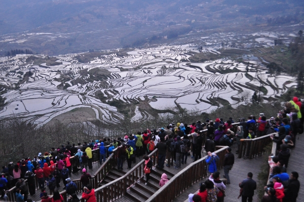 Visitors go sightseeing at the Hani terraced paddy fields in south Yunnnan's Yuanyang county. (Yunnan Daily/ Long Jun)