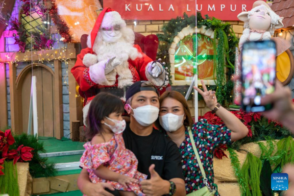 People pose for photos in front of Christmas decorations at a shopping mall in Kuala Lumpur, Malaysia, Dec. 23, 2021. (Photo by Chong Voon Chung/Xinhua)