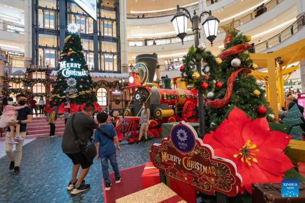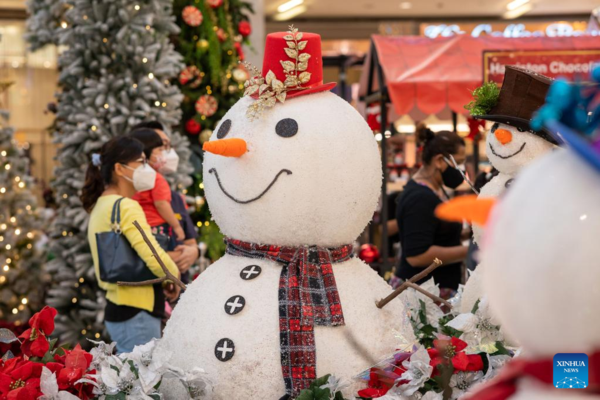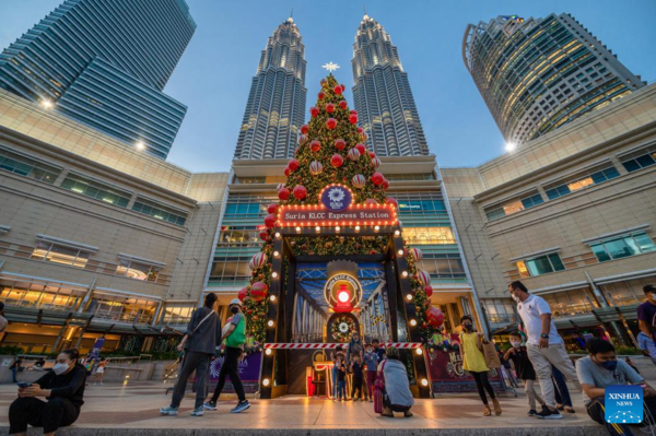 People wearing face masks walk by the Christmas decorations at a shopping mall in Kuala Lumpur, Malaysia, Dec. 23, 2021. (Photo by Chong Voon Chung/Xinhua)