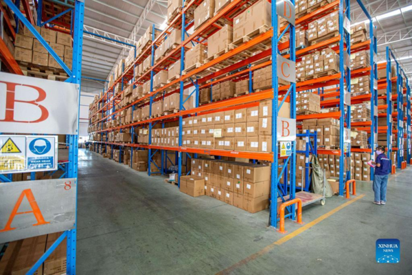 A worker is seen at a warehouse of the Thai-Chinese Rayong Industrial Zone, in Rayong province, Thailand, on Dec. 29, 2021. The Thai-Chinese Rayong Industrial Zone, which is located at the east coast of Thailand, has attracted more than 170 enterprises. (Xinhua/Wang Teng)