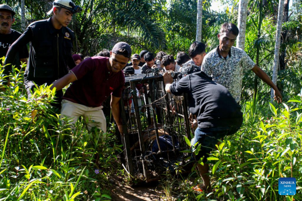 People carry a three-year-old female wild Sumatran tiger after it was rescued and evacuated by West Sumatra Natural Resources Conservation Agency (BKSDA) from oil palm plantation for observation at Mauna Hilia village in Agam district, West Sumatra, Indonesia, Jan. 11, 2022. (Photo by Andri Mardiansyah/Xinhua)