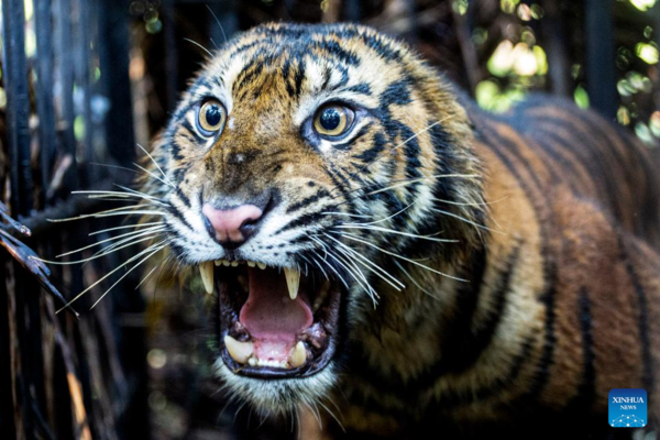 A 3-years-old female wild Sumatran tiger is seen inside a cage after it was rescued and evacuated by West Sumatra Natural Resources Conservation Agency (BKSDA) from oil palm plantation for observation at Mauna Hilia village in Agam district, West Sumatra, Indonesia, Jan. 11, 2022. (Photo by Andri Mardiansyah/Xinhua)