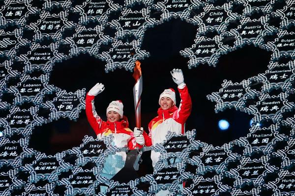 The torch was first relayed between five prominent Chinese athletes representing a decade of birth from the 1950s to the 1990s and passed to Dinigeer and Zhao, who jointly lit up the expectation and future of the Olympics.