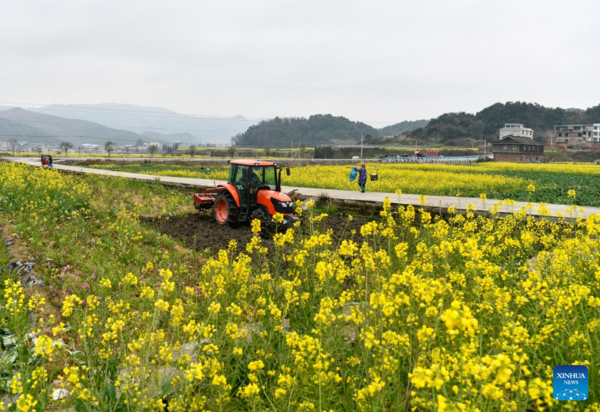 Farmers work in the field in Hexin Village of Qianxi City, southwest China's Guizhou Province, Feb. 19, 2022. Saturday marks the day of Yushui, or Rain Water, the second of the solar terms. As Yushui arrives, the temperature will rise and rain will become frequent. Farmers across Guizhou are busy with spring agricultural production. (Photo by Fan Hui/Xinhua)