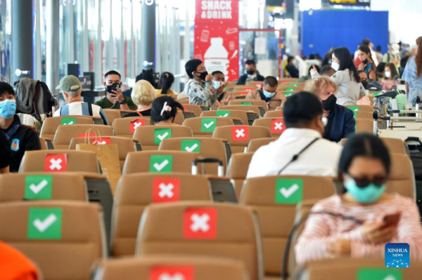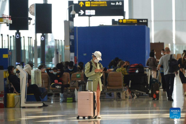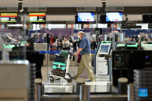 Passengers are seen at the Suvarnabhumi International Airport in Bangkok, Thailand, on March 1, 2022. Thailand eased entry quarantine requirements from Tuesday, reducing the COVID-19 test to one time after entry, and the COVID-19 insurance required for inbound travelers reduced to 20,000 U.S. dollars. (Xinhua/Rachen Sageamsak)