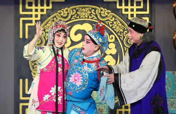 Wang Xiaoli, Liu Mingzhe and Zhao Shikang, who are all Wang Rongrong's students, perform an exerpt of classic Peking Opera piece at the event. [Photo by Zou Hong/China Daily]